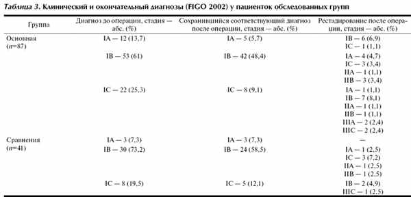 Основную долю в исследовании составили пациентки с IB стадией заболевания - 63%. Ограничения разрешающей способности инструментальных методов обследования (УЗИ, МРТ) не исключают получение ложноположительных и ложноотрицательных результатов. Сопутствующие фоновые процессы в матке (миома, аденомиоз) создают объективные трудности для правильной оценки распространенности опухоли. В связи с этим в обеих группах отмечены случаи изменения диагноза рака тела матки как в сторону увеличения, так и уменьшения стадии. У 32 (36,8%) пациенток в основной группе и у 9 (22%) в группе сравнения первичный диагноз был изменен на основании результатов планового гистологического исследования (табл. 3).