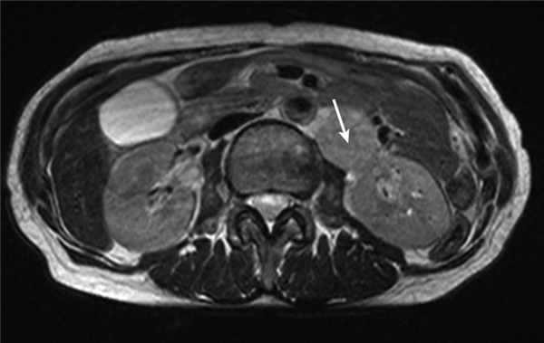 Медиана наблюдения пациенток группы сравнения составила 45,5 мес. За это время одна пациентка 64 лет была исключена из исследования в связи с летальным исходом в раннем послеоперационном периоде, возникшем на фоне ТЭЛА. В одном случае у больной 60 лет с диагнозом рак эндометрия IIA стадии (T2aNoMo) через 15 мес после окончания первичного лечения (операция с адъювантной сочетанной лучевой терапией) диагностирован рецидив заболевания: при контрольном обследовании в парааортальной зоне в области ворот левой почки выявлен конгломерат опухолевых узлов до 4 см (рис. 4). Рисунок 4. Рецидив опухоли в виде конгломерата лимфатических узлов в области ворот левой почки (стрелка) у больных группы сравнения.