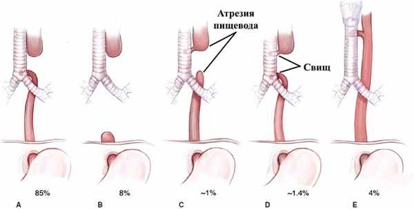По происхождению пищеводно-респираторные свищи разделяют на врождённые и приобретенные. Врождённые свищи наблюдаются в 1-4% всех заболеваний пищевода у детей и более чем в 2-3% случаев сочетаются с атрезией пищевода (рис. 2).
