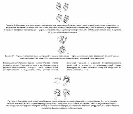 Единственным радикальным методом лечения пищеводного свища является хирургический. Свищевой ход выделяют и иссекают. Дефекты стенки пищевода и другого органа поочередно ушивают. Линию швов дополнительно укрепляют местными тканями (плеврой, перикардом, мышцей, диафрагмой, сальником и т.п.) (рис. 4).