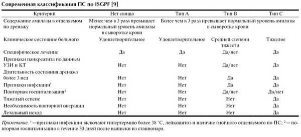 Согласно рекомендациям международной группы по изучению панкреатических свищей (ISGPF, 2005 г.), доказательством ПС считается наличие панкреатогенного отделяемого по дренажу с уровнем амилазы, в 3 раза превышающим ее нормальное содержание в сыворотке крови на 3-и и более поздние сутки послеоперационного периода [9] (уровень доказательности А). Согласно этому определению, ПС делятся на 3 типа (см. таблицу).