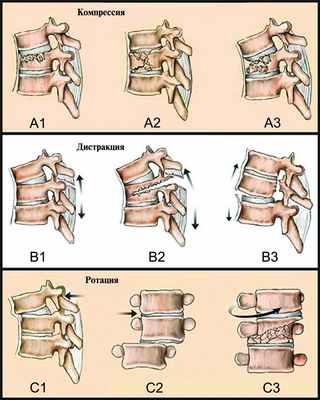 Рисунок 1. Виды повреждений позвонков (в соответствии с лассификацией F. Magerl и соавт., 1994) [47]
