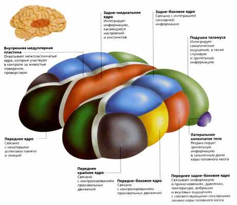 В таламусе выделяют до 120 ядер серого вещества. По месту их расположения ядра делят на передние, латеральные и медиальные группы. В задней части латеральной группы ядер таламуса выделяют подушку, медиальное и латеральное коленчатые тела.
