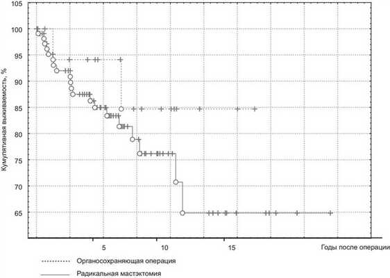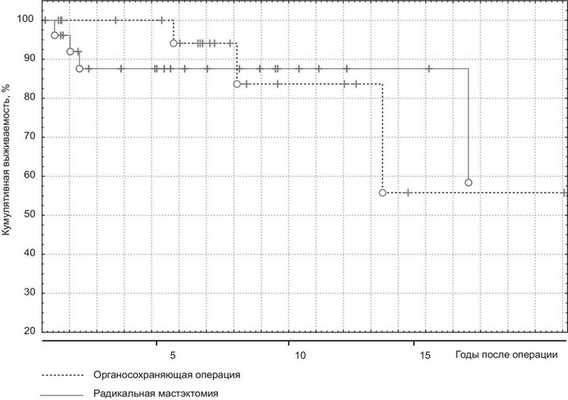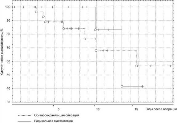Через 10 и 15 лет значение этого показателя в последней группе также было выше, составив 82% в оба срока наблюдения, тогда как для больных, которым была выполнена мастэктомия, кумулятивная выживаемость снизилась через 10 лет до 76%, спустя 15 лет - до 64%.