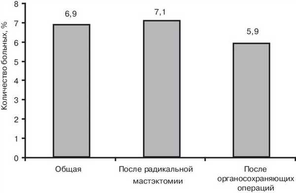 Спустя 15 лет выживаемость больных, которым была выполнена радикальная мастэктомия, составила 56%, после органосохраняющей операции снизилась до 42%.