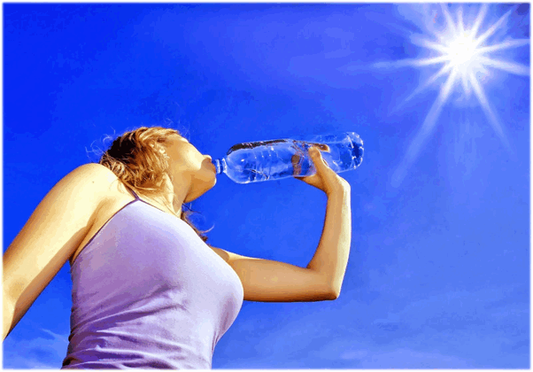 Чтобы избежать перегрева, вовремя восполняйте потери жидкости организмом, лучше для этого использовать чистую воду. Сладкие напитки только усилят жажду. Существует распространенное заблуждение, что утолить ее можно пивом. Однако алкоголь, содержащийся в нем, будет только способствовать дегидратации организма, а жаркая погода усилит нагрузку на выделительную систему, которая и так работает в полную силу. Жидкость необходимо пить вне зависимости от ощущения жажды через каждые несколько часов. Максимум чистого поглощения воды в кишечнике составляет около 20 мл/мин (1200 мл/ч, что ниже максимальной скорости потоотделения 2000 мл/ч).