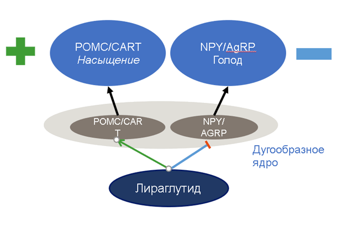 стимулирует центр насыщения и подавляет центр голода через действие на специфические нейроны.