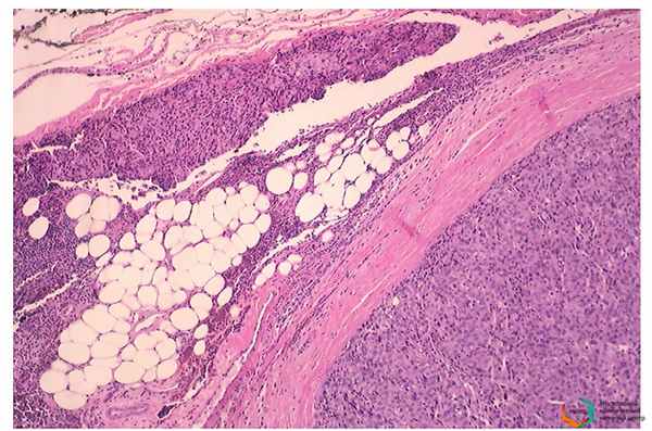 - Злокачественная тимома 2-го типа (рак тимуса, тимома типа C) составляет до 5% всех наблюдений. Отличается выраженным инвазивным ростом, высокой метастатической активностью (дает метастазы в плевру, легкие, перикард, печень, кости, надпочечники). Выделяют 6 гистологических типов рака тимуса: плоскоклеточный, веретеноклеточный, светлоклеточный, лимфоэпителиальный, недифференцированный, мукоэпидермоидный.