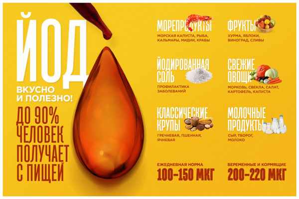Получить достаточное количество йода организм может только извне. Основными поставщиками йода считаются морепродукты, а также некоторые ягоды (черная смородина, клубника, черный виноград, черноплодная рябина) и овощи ( редька, морковь, спаржа, шпинат, томаты, картофель, ревень, капуста, лук). Также источником йода для человека являются: мясо, яйца, молоко. Следует помнить, что кулинарная обработка и длительное хранение уменьшают содержание йода в продуктах.