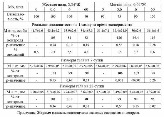 Таблица 3. Изменение биологических показателей D. magna под влиянием ионов молибдена