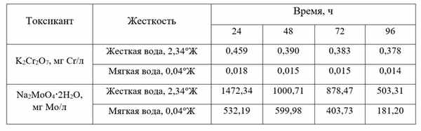 По результатам острых опытов были рассчитаны значения полулетальных концентраций за 24, 48, 72 и 96 часов (табл. 1). Хром и молибден проявляли большую токсичность в мягкой воде. При этом токсичность хрома по показателю ЛК50 менялась более чем в 25 раз, тогда как у молибдена менее чем в три раза. Исследования зависимости острой токсичности металлов исследуют, как правило, при больших значениях жесткости. При этом выраженность эффекта зависит как от вида металла, так и от диапазона жесткости. Так, при увеличении жесткости с ~ 6 до ~30°Ж токсичность хрома для D. magna уменьшалась в 3,5 раза, а меди – в 1,5 раза (Park et al., 2009). При изменении жесткости с 4,9 до 34°Ж значения полулетальных концентраций хрома изменялась в 27 раз (Persoone et al., 1989).