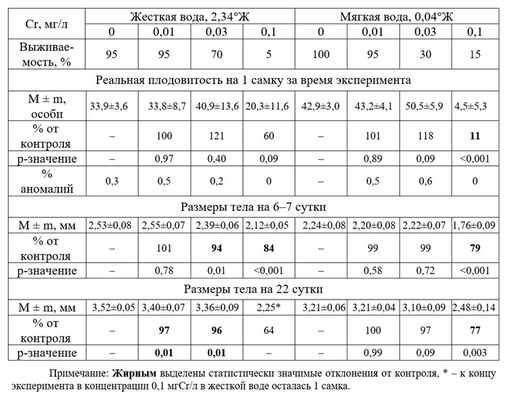 Уже на 6–7 сутки наблюдалось достоверное уменьшение размеров тела дафний при концентрациях 0,03 и 0,1 мгCr/л в жесткой воде и при концентрации 0,1 мгCr/л – в мягкой. На 22 сутки было отмечено достоверное уменьшение размеров в жесткой воде в концентрациях 0,01 и 0,03 мгCr/л (97% и 96% от контроля); в мягкой воде достоверные отличия наблюдались только в концентрации 0,1 мгCr/л (77%). Таким образом, в хронических исследованиях в мягкой воде хром оказал большее токсическое воздействие на выживаемость и плодовитость рачков, тогда как в жесткой воде – на изменение размеров тела.