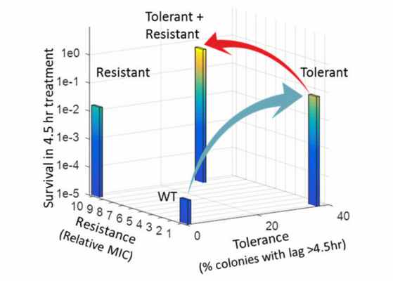 Предлагаемый авторами механизм возникновения резистентной популяции на фоне толерантной. Обыкновенная популяция эволюционирует в толерантную (синяя стрелка), что способствует выживанию большего числа бактерий и служит опорой для развития резистентности (красная стрелка)