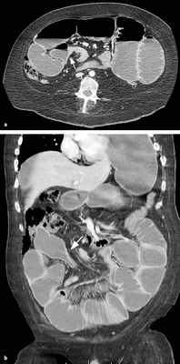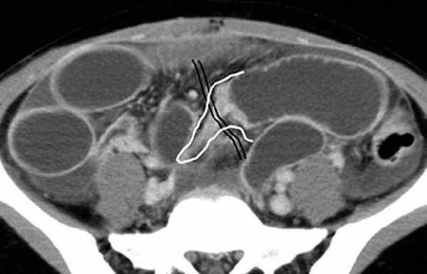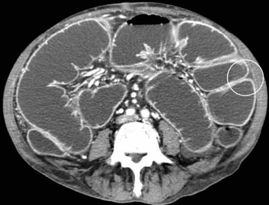 Для странгуляции тонкой кишки характерны утолщение стенок кишечника, васкулярные нарушения и выраженные патологические изменения в брыжейке и в брюшной полости. Диагностические находки включают в себя:
