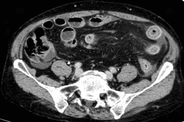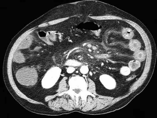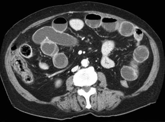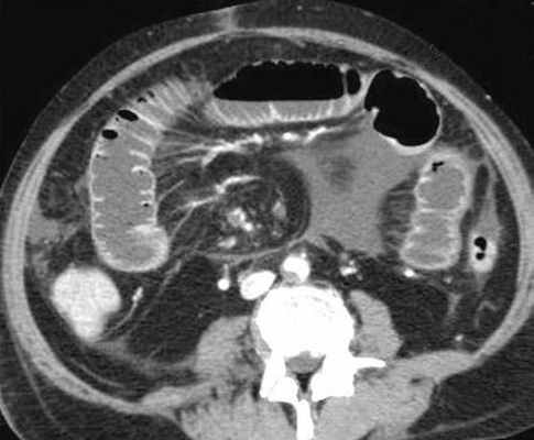 -нарушение нормального контрастного усиления стенок кишки. Изменения варьируют от гиперконтрастирования до полного отсуствия контрастного усиления. Различные варианты этих изменений между описанными выше крайностями могут наблюдаться одновременно в разных сегментах тонкой кишки. Полное отсутствие усиления означает артериальный рефлекторный спазм и свидетельствует в пользу тяжести поражения;