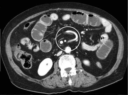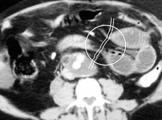 -при заворотах нарушается нормальная сосудистая анатомия брыжейки. Сосуды как бы закручиваются вокруг оси заворота и тянут за собой измененный брыжеечный жир- по типу раковины улитки или торнадо. Для большей наглядности представьте себе кусок расправленной ткани на столе, которую вы прижали пальцем и начали закручивать не отрывая ваш палец от стола. На КТ сканах часто можно увидеть характерный признак конусовидной спирали (whirl sign);