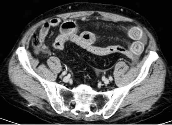примеры странгуляционной осложнённой непроходимости с характерными изменениями в брыжейке, внутрибрюшинном жире, утолщением стенок тонкой кишки и нарушением контрастного усиления.