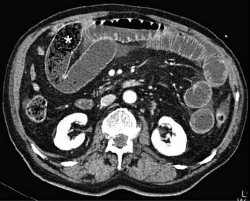 -пристеночный пневматоз тонкой кишки, в особо тяжелых случаях появляются интрамуральные пузырьки газа;