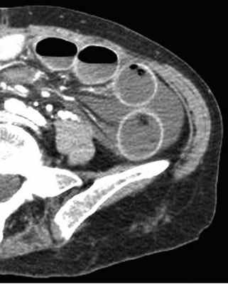 -утолщение стенки кишки циркулярного типа. Важно помнить, такой тип утолщения стенок тонкой кишки при непроходимости как правило связан с сосудистыми нарушениями;