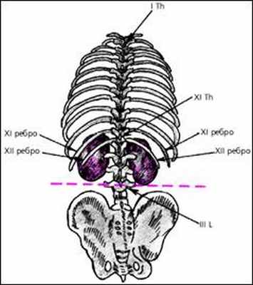 Почки располагаются по бокам от позвоночника на уровне с XII груд-ного до II поясничного позвонка. Правая почка лежит ниже левой: XII ребро делит левую почку пополам, от правой почки оно отсекает верхнюю треть.