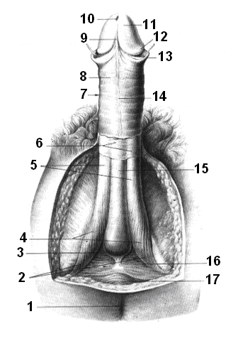 1 – задний проход, anus; 2 – radix penis; 3 – луковица полового члена, bulbus penis; 4 – седалищно-пещеристая мышца, m. ishiocavernosus; 5 – пещеристые тела полового члена, corpora cavernosa penis; 6 – поверхностная и глубокая фасции полового члена, fasciae penis superficialis et profunda; 7 – тело полового члена, corpus penis; 8 – integumentum commune; 9 – ухдечка крайней плоти, frenulum preputii; 10 – наружное отверстие мочеиспускательного канала, ostium urethrae externum; 11 – головка полового члена, glans penis; 12 – венец головки, corona glandis; 13 – крайняя плоть полового члена, preputium penis; 14 – шов полового члена, raphe penis; 15 – губчатое тело полового члена, corpus spongiosum penis; 16 – глубокая поперечная мышца промежности, m. transversus perinei profundus; 17 – наружный сфинктер заднего прохода, m. sphincter ani externus.