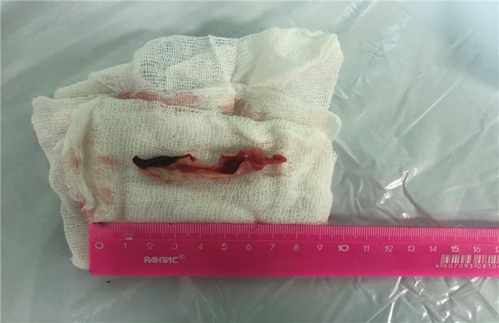 Особенностью оперативного вмешательства явилась необходимость выполнения тромбэктомии из воротной вены, вследствие наличия сопутствующего тромбоза, с целью восстановления адекватного физиологического притока портальной крови к печени.