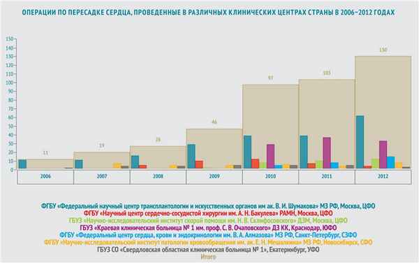 На сегодняшний день в России существует 10 центров, осуществляющих трансплантацию сердца (все данные приведены в соответствии с информацией, опубликованной в журнале «Вестник трансплантологии» за 2009–2013 год).