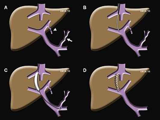 Этапы процедуры TIPS: A) портальная гипертензия вызвала коронарная вена (стрелка) и пупочная вена (стрелка), чтобы расшириться и течь в обратном направлении. Это приводит к варикозному расширению вен пищевода и желудка, которое может кровоточить; Б) игла введена (через яремную вену) и проходит из печеночной вены в воротную вену; в) тракт расширен баллоном; D) после установки стента портальное давление нормализуется, и коронарные и пупочные вены больше не заполняются.
