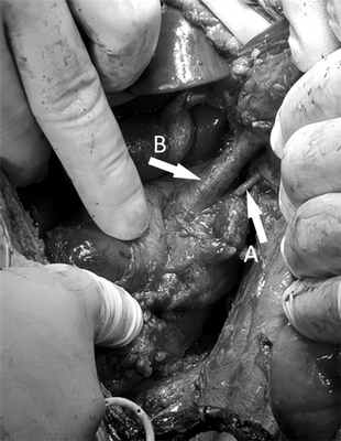 Таким образом, через 3 мес после исходной травмы произведена срединная лапаротомия. При ревизии в брюшной полости выявлен умеренно выраженный спаечный процесс. Правая почка крупных размеров, полностью вовлечена в воспалительно-рубцовый конгломерат, область ворот также представлена рубцовой тканью, окружающей сосудистую ножку, лоханка не дифференцируется. Визуально диаметр почечной артерии в 3—4 раза меньше, чем диаметр вены — около 3,5 мм (рис. 4). Рис. 4. Правые почечные артерия и вена после их диссекции.