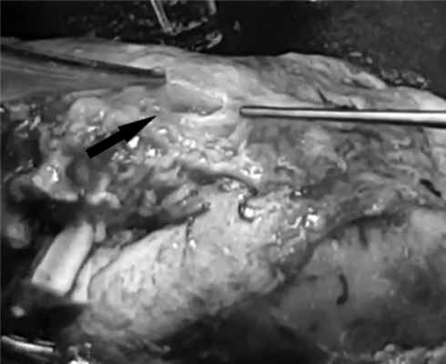 Правый мочеточник, деформированный периуретеральными сращениями, прослеживался от мочевого пузыря до нижнего полюса почки, далее превращался в плотный тяж, лишенный просвета. Протяженность этого участка до 5 см. С учетом полученных данных решено отказаться от попыток восстановить длину мочеточника путем пластики собственными тканями. Облитерированная часть мочеточника резецирована, проходимость оставшегося дистального отдела подтверждена с помощью контрастной пробы. Почка с трудом мобилизована из сращений (при этом потребовалась ее частичная декапсуляция), почечные сосуды пересечены, начата процедура холодовой ишемизации органа с перфузией раствором для кардиоплегии. После извлечения из брюшной полости почка помещена в емкость с ледяным физиологическим раствором для дальнейшей подготовки к пересадке. На данном этапе определенную сложность представляла идентификация редуцированной лоханки, которая располагалась внутрипочечно, а также поиск и выделение из рубцов зоны для последующей пиелоуретеростомии (рис. 5). Рис. 5. Редуцированная лоханка правой почки и место отрыва мочеточника (показано стрелкой). В целом холодовая ишемия органа продолжалась 55 мин.