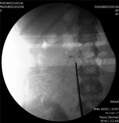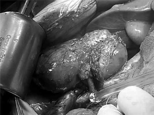 Затем выполнили релюмботомию. Установлено, что околопочечная клетчатка практически полностью трансформирована в рубцовую ткань хрящевой плотности. С большим трудом из сращений выделили часть ворот почки, где обнаружены место отрыва мочеточника и образовавшийся при этом дефект стенки лоханки, через который поступала моча. Дистальный отдел мочеточника в рубцовом конгломерате обнаружить не представлялось возможным. Стало очевидно, что реконструкцию мочевых путей на данном этапе произвести не удастся. Операцию завершили установкой пиелостомы через зону разрыва. В дальнейшем она функционировала хорошо, в результате мочевой затек существенно уменьшился в размерах.