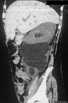 Пациентка Ш., 8 лет, пострадала в дорожно-транспортном происшествии в апреле 2018 г., оказавшись пассажиром автомобиля в момент его столкновения с препятствием на высокой скорости. Взрослый пассажир, также находившийся в машине, погиб, девочку доставили в больницу, расположенную в одном из городов Южного федерального округа Р.Ф. Состояние ребенка характеризовалось как тяжелое, но показаний к немедленному хирургическому вмешательству не выявлено. В течение 15 дней состояние оставалось относительно стабильным, за это время проведено рентгенологическое обследование, в ходе которого установлено наличие множественных скелетных травм (переломы костей таза, верхних и нижних конечностей). К концу этого периода при повторном УЗИ выявлены признаки ранее не распознанного повреждения правой почки с формированием обширной околопочечной урогематомы. МСКТ с контрастным усилением показала снижение экскреторной функции правой почки с экстравазацией контрастного препарата и распространением его до уровня крыла подвздошной кости (рис. 1). Рис. 1. Обширная урогематома у пациентки Ш. через 17 сут после травмы.