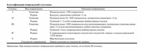 Повреждения селезенки классифицируют по 5 степеням тяжести.