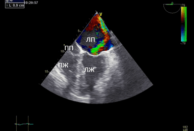 Рис. 3. Чреспищеводная эхокардиография. Среднепищеводный доступ. Четырёхкамерная позиция. Vena contracta 0,9 см.