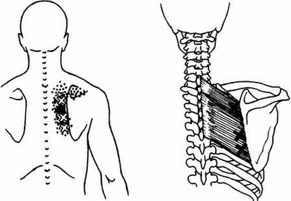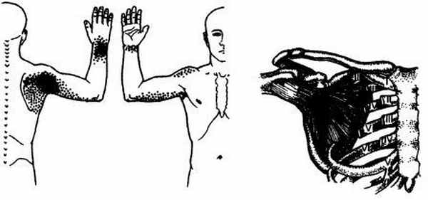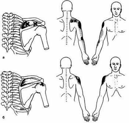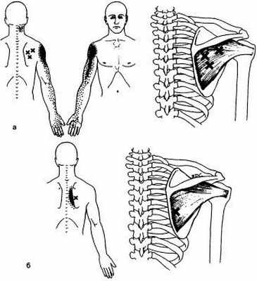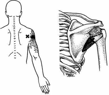 Триггерные точки отражают боль в область плечевого сустава и лопатки, заднюю поверхность плеча, лучезапястного сустава