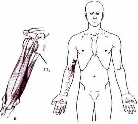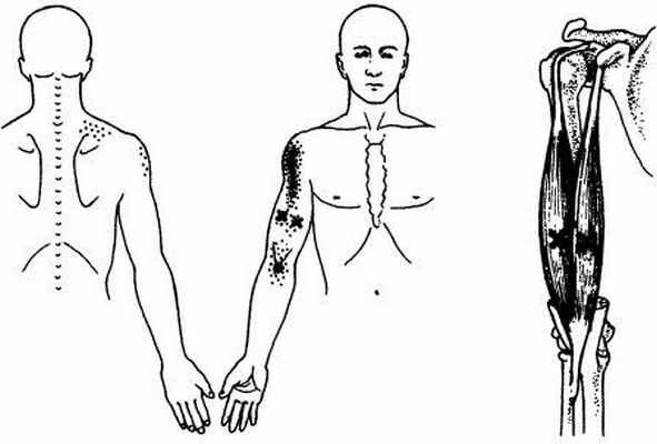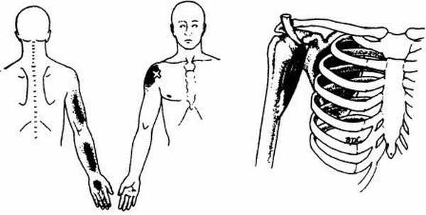 Триггерные точки отражают боль в область длинной головки трехглавой мышцы плеча и редко в тыльную область предплечья