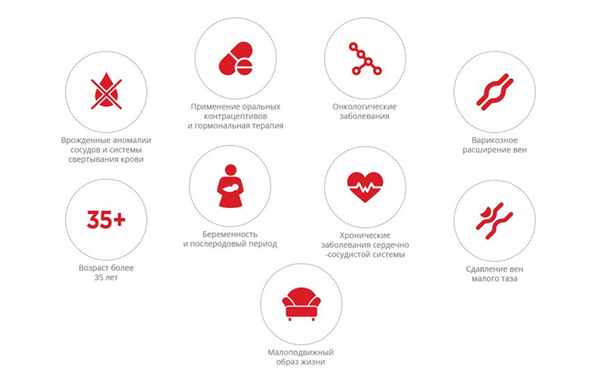 Вероятность образования тромбов во время беременности увеличивают врожденная тромбофилия (состояние повышенной свертываемости крови), кесарево сечение, зрелый возраст роженицы и избыточный вес. Если женщина ранее рожала три и более раз или имеет многоплодную беременность (двойня и более) риск тромбоза также повышается. Дополнительными факторами риска образования тромбов выступают: гипертония, сердечно-сосудистые заболевания и сахарный диабет; применение оральных контрацептивов перед беременностью; обезвоживание.