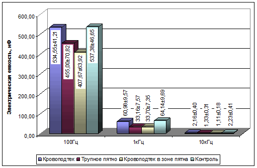 В ходе проведения исследований установлены значения электрической емкости и электрического сопротивления мягких тканей гнилостно трансформированных трупов, как неповрежденной кожи, так и кровоподтека, в том числе расположенного в области трупного пятна (рис. 2-3).