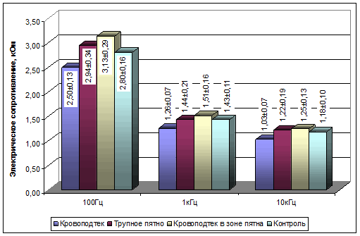 Как следует из представленных рисунков, между значениями исследованных областей (кровоподтек, трупное пятно, кровоподтек в зоне пятна, контрольный участок) существуют некоторые различия, хорошо отслеживаемые на графиках (численные значения изучаемых величин приведены на соответствующих столбцах диаграммы в соотношении с ошибкой среднего арифметического).