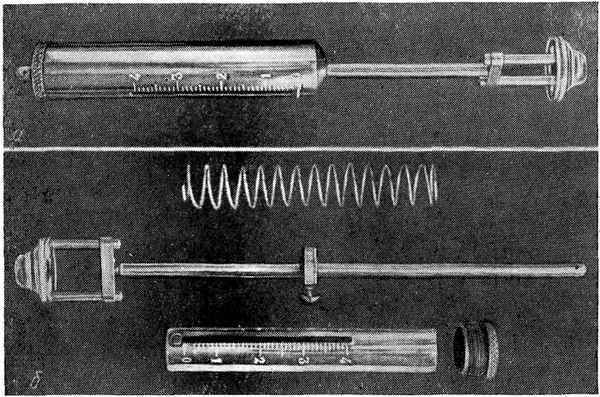 Динамометр для придавливания трупных пятен в собранном (а) и разобранном (б) виде.