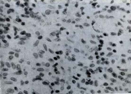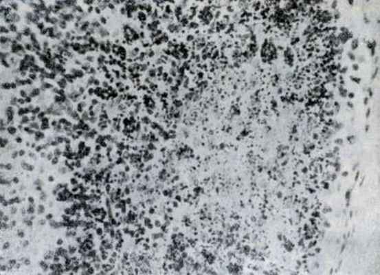 Поэтому в разгар заболевания остается только узкая зона из немногочисленных зрелых лимфоцитов, а на всей площади лимфатического фолликула преобладают ретикулярные и плазматические клетки, богатые рибонуклеиновой кислотой [Куршакова Н. Н., 1958, 1961].