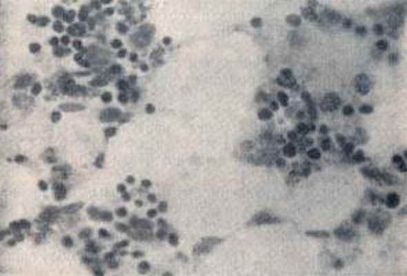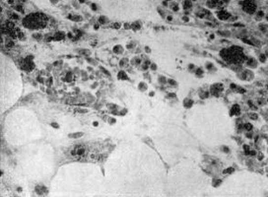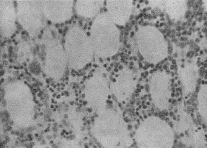 ![]() | Костный мозг собаки через 13 дней после подкожного введения полония (0,1 мкКи/кг массы животного). Значительная убыль клеток кроветворной ткани, набухание ретикулярных клеток, образование клеток плазматического типа. |