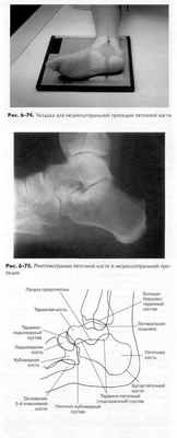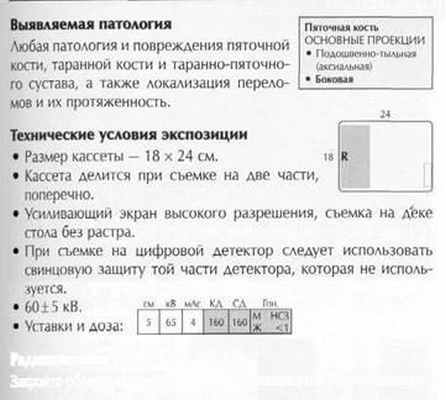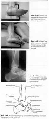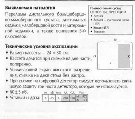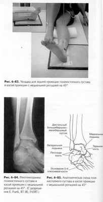 Примечание: если нога пациента свободно вытянута или подошвенная поверхность находится под углом 10-15° к вертикали, то пяточная кость накладывается на латеральную лодыжку при медиальной ротации стопы на 45°, таким образом затемняя область интереса.