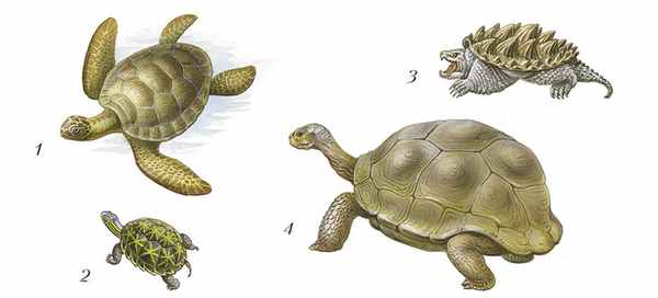 Рис. 148 . Разные виды черепах: 1 — зелёная (суповая) черепаха; 2 — звёздчатая черепаха; 3 — грифовая черепаха; 4 — слоновая черепаха