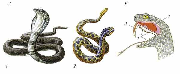 Рис. 146 . Змеи: А — представители ядовитых змей: 1 — кобра; 2 — гремучая змея; Б — ядовитый аппарат змеи: 1 — обычные зубы; 2 — ядовитый зуб; 3 — ядовитая железа