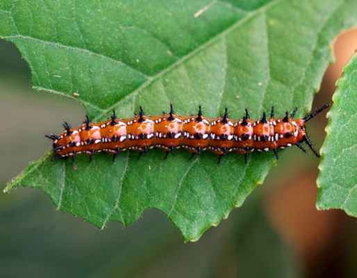 Признать в гусенице адмирала будущую бабочку не так легко. Темный окрас, желтые точки по бокам туловища и пугающие шипы – насекомое прекрасно защищено от птиц и умеет маскироваться. Встретить его можно с мая по август на листьях крапивы, хмеля и чертополоха.