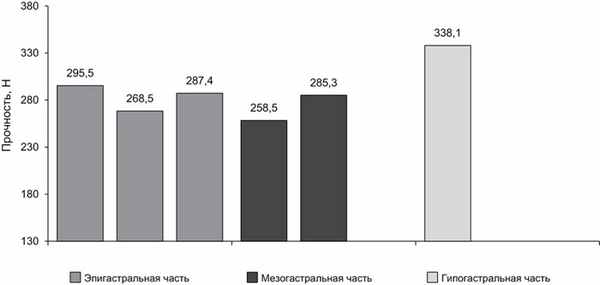 В мезогастральной части прочность первого верхнего участка была 243,4—271,6 Н (258,5±12,3 Н), второго участка — 275,4—298,6 Н (285,3±10 Н) (tСт=0,359, р<0,05).