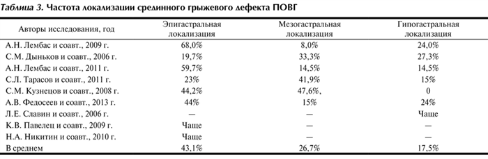 Последующий анализ литературных данных (табл. 3) Таблица 3. Частота локализации срединного грыжевого дефекта ПОВГ указал на то, что эпигастральная локализация является наиболее частым местом несостоятельности послеоперационного рубца — в 43,1% наблюдений. Мезогастральная и гипогастральная локализации встречаются в 26,7 и 17,5% случаев соответственно. Хотя некоторые авторы утверждают, что возврату заболевания способствуют именно наличие предшествующих рецидивов в анамнезе и срединная мезо- и гипогастральная локализация грыжи [7].
