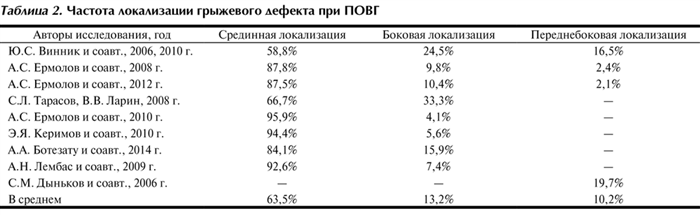 Проведя анализ источников литературы, выявлено, что срединная локализация послеоперационного грыжевого дефекта встречается в 63,5% случаев, боковая — в 13,2%, переднебоковая — в 10,2% (табл. 2) Таблица 2. Частота локализации грыжевого дефекта при ПОВГ [4].