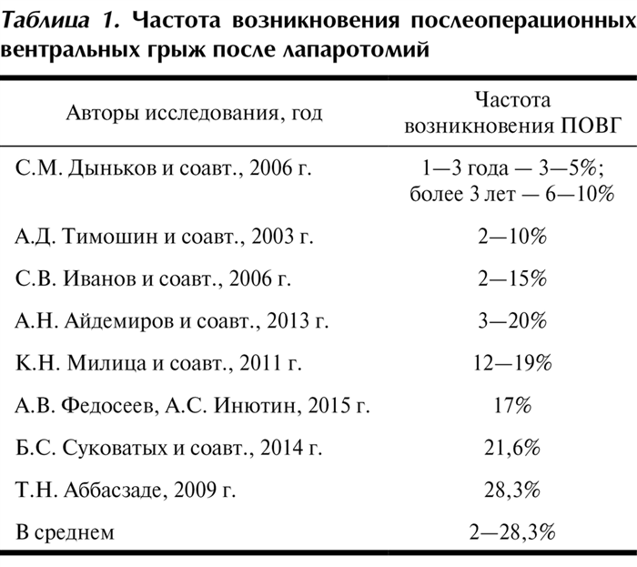 Сегодня срединная лапаротомия считается доступом выбора при абдоминальных операциях. Однако частота возникновения послеоперационных грыж (ПОВГ) после срединных лапаротомий достигает 28,3% (табл. 1). Таблица 1. Частота возникновения послеоперационных вентральных грыж после лапаротомий